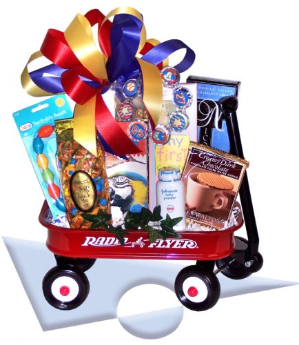Baby shower gifts from WFGB for the new little one and the expectant mom. Our genuine Radio Flyer Wagon (scaled down size) is stacked full of tasty goodies mom will enjoy and some necessities for baby. Every child loves their wagons (little girls love wagons too) and this is no exception. This collectable can be used in the childs room to display his or her stuffed animals and toys. You will enjoy watching her unpack baby teething toys, baby powder, sweet and salty snack mix, my first sugar cookies, hazelnut confection cookies, babys first book, crisp snack crackers and more. Give baby shower gifts that will be remembered for years to come, an original from World Famous Gift Baskets. Approx. number of basket contents: 22-25. Note: The gift basket design shown is typical. Due to supply and demand, however, gift basket design and any contents may vary with each purchase