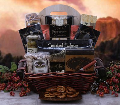 This assortment of delightful edibles is perfect for sending someone best wishes, congratulations, birthday greetings or thinking of you. Packed full of gourmet select items with Bellagio gourmet flavored coffees, our favorite gourmet cheese spread and cheese knife with peppercorn crackers and water crackers, Kasilof smoke salmon, jar of gourmet stuffed olives, salted pistachios and a cutting board for serving all these items on. Also included for the sweet tooth is a selection of Fancy Kernels gourmet caramel popcorn and butter toffee pretzels. These items are all hand packed into a keepsake woodchip basket with leather handles and matching bow. (basket styles or products may be substituted)