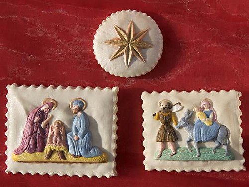 The Gourmet Springerle Nativity Cookie Gift Tin is a delightful and delicious treat from Embossed Edibles. Each cookie (2 1/2 inches up to 3 1/2 x 2 1/2 inches) is an artistic, hand decorated masterpiece. This gift tin includes three molded lemon Springerle Cookies that celebrate the Christmas season: Mary and Joseph kneeling beside the Baby Jesus, a large gold star, and Joseph leading Mary on a donkey. The cookies come individually wrapped and packaged in a platinum gift tin with satin ribbon and an embossed seal. Enjoy these artistic Christmas cookies yourself or give them as a gift! When you place your order, each cookie is created using a Springerle mold and then baked and hand-decorated. These Springerle cookies have a unique rich lemon cake-like texture inside with a crispy outside. Springerle molds and recipes used for baking cookies come from a very old European tradition. These cookies can be eaten, or left to air dry and be used as ornaments. Allow 1 week before cookies are shipped. No expedited orders.