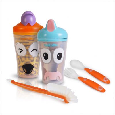 51197G Features: -Set includes: sports flip top straw cup with soft non spill spout, sipper cup, bottle brush and cutlery. -BPA free. -Sturdy and comfortable handle. -Assorted patterns: Cow, zebra, tiger and giraffe. -Insulated 3D cups are designed to minimize drips and spills. -Designed with a handy flip straw for toddlers on the go. -Cups help to encourage your child to develop proper drinking habits. -Included the use of a handy brush can be used to easily clean. -Ergonomic design of the bowl and utensils your baby will be encouraged to eat Proper Sequence. -Designed to increase hand eye coordination during the early stages of eating. -Soft silicon straw safe for baby's gums. -Straw protector keeps the cup very hygienic. -Cup gives a rattling sound when shaken up or while in use. -Insulation maintains the original temperature of the drink longer. -Unique silicon valve is very easy to clean. -Soft bristles to clean bottles and nipples.-Soft lower rubber tip effectively cleans the nipples. -Protective case is good for storage when not in use. -Contoured angle for hard to reach places. -Dishwasher safe.